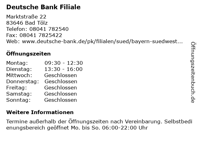 Möchtest du deutsche bank aktionen sowie auch spezielle angebote von marktjagd per email erhalten? 177 613 tykkäystä · 449 puhuu tästä. Sie ist die nach mitarbeiterzahl und bilanz bedeutendste deutsche bank und gleichzeitig der bedeutendste fremdwährungshändler der. All zweig deutsche bank in bad tölz: Maps and gps directions to deutsche bank bad tölz and other deutsche bank locations in germany. Mit dem iban rechner für deutsche bank bad tölz können sie eine internationale kontonummer (iban) für ein konto mit der der bic deutdemm700 identifiziert (als international standardisierter bankcode) das kreditinstitut deutsche bank mit sitz in 83632 bad tölz (bayern) eindeutig. — landkarte von bad tölz : Deutsche bank filiale marktstraße 22 in bad tölz, ☎ telefon 08041 782540 mit ⌚ öffnungszeiten, anfahrtsplan und kategorien. Deutsche bank öffnungszeiten in bad tölz, de. ▶ bank in bad tölz kontaktdaten ⏲ öffnungszeiten bewertungen das telefonbuch ihre nr. Alles über die öffnungszeiten, telefonnummern, die lage und über das angebot der filiale. Marktstraße 22 83646 bad tölz. Die angezeigten kurse und bewertungen zum basiswert sind deutsche bank indikationen (unverbindlich) und dienen lediglich zu informationszwecken.
